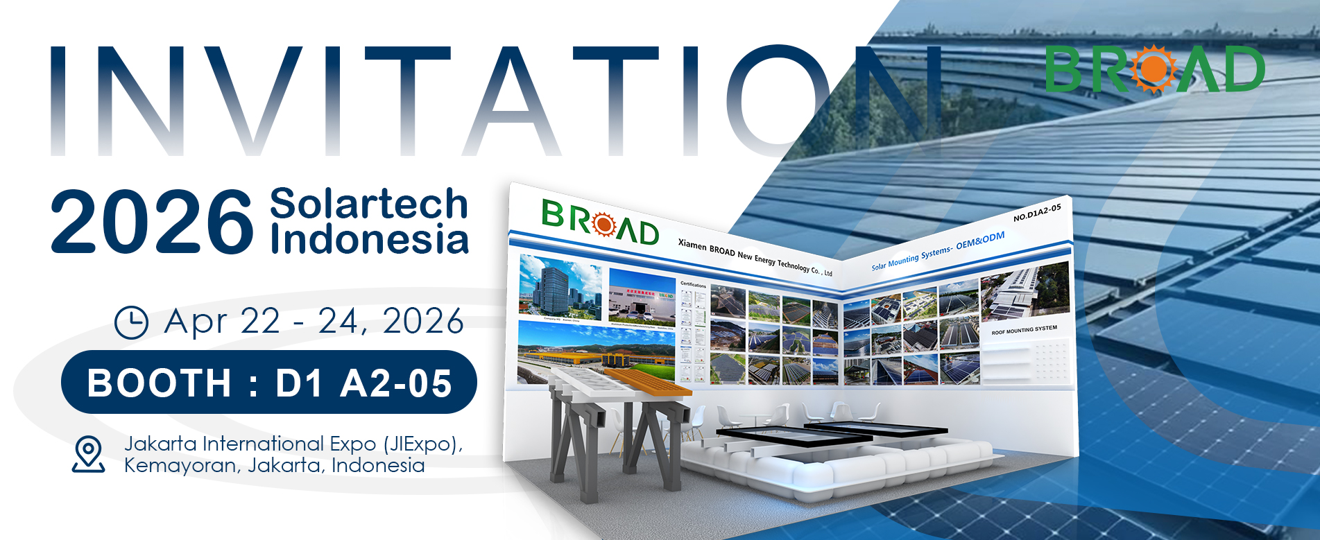 সৌর মাউন্টিং সিস্টেমের শীর্ষস্থানীয় সরবরাহকারী হিসাবে, ব্রড সর্বদা সৌর পিভি শিল্পে সক্রিয় ভূমিকা পালন করে by বিশ্বজুড়ে সৌর শক্তি প্রদর্শনীতে অংশ নেওয়া, প্রশস্ত আমাদের সৌর মাউন্টিং সিস্টেমগুলি আরও ভালভাবে উপস্থাপন করতে পারে।